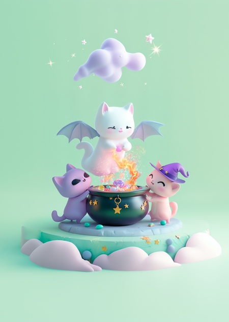 (2) A vibrant and enchanting poster for the brand «Sweety Witchy» celebrating children’s creative confectionery experiments. The poster features three delightful animal characters enjoying delicious sweets: a white ghostly cat playfully eating a candy, a pink fox wearing a whimsical purple witch hat savoring a cupcake, and a cheerful purple bat enjoying a colorful lollipop. The background is magical and dreamy, with pastel tones, glowing stars, and soft sparkles that evoke a sense of wonder and creativity. The design captures a fun and imaginative atmosphere, perfect for inspiring young creators to experiment with tasty treats! --ar 2:3 — Pan Down