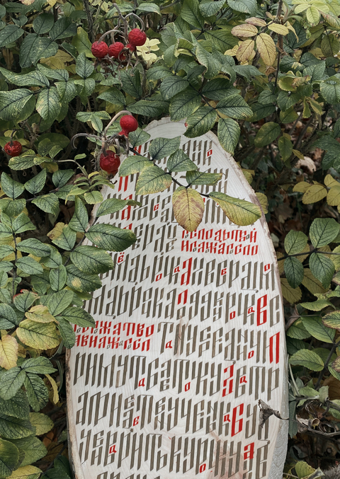 Россия и вязь ассоциируются у меня с природными материалами, поэтому я выбрала деревянные спилы. Красные буквы означают начало новой строки.