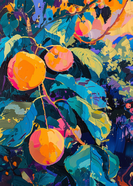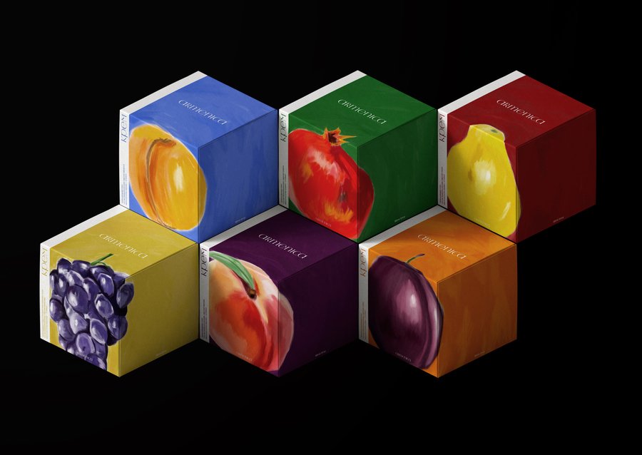В оригинальном брендинге я использовала иллюстрации, которые рисовала сама. Сейчас я решила опять построить графический образ на иллюстрациях фруктов. Подобрав подходящий промпт, я сгенерировала несколько иллюстраций, которые потом использовала в постерах и упаковке.