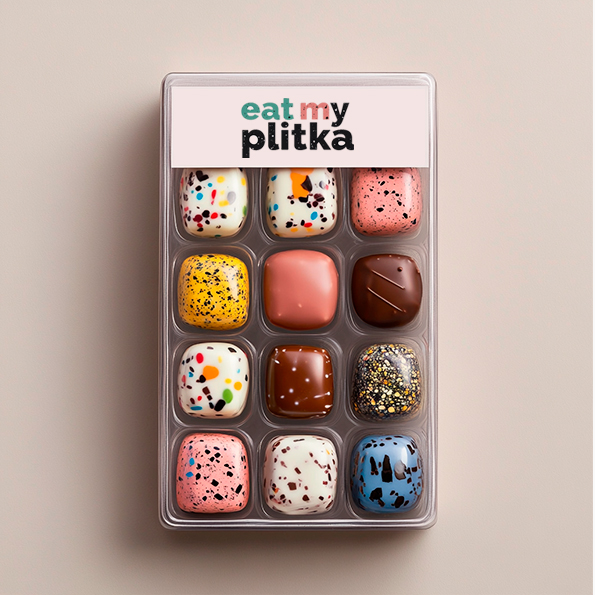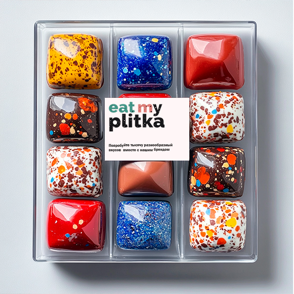 A set of colored chocolates, each of which resembles a terrazzo tile with a glossy surface and multicolored inclusions. The candies are packed in a transparent rectangular box with glossy edges. The box is decorated in a minimalist style, which creates an elegant and modern style. The logo is printed on a white square in a minimalistic font with imitation terrazzo texture for the company «Eat my plitka», which produces confectionery products imitating the terrazzo texture. It is necessary to use black and mint, pink colors.