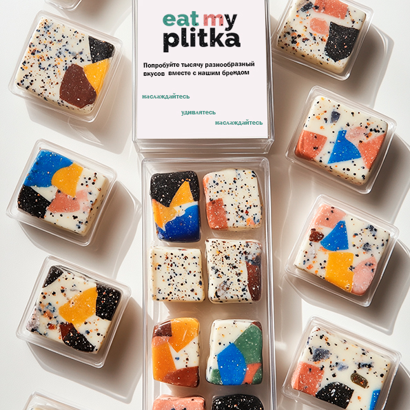 Вдохновленная красотой и визуальной «вкусностью» терраццо от производства «Lick my brick», я решила создать «Еаt my plitka» — кондитерский бренд, специализирующийся на создании конфет и шоколада, посвященных красоте терраццо и его функциональной форме. Здесь можно найти кондитерские изделия на любой вкус, цвет и форму.