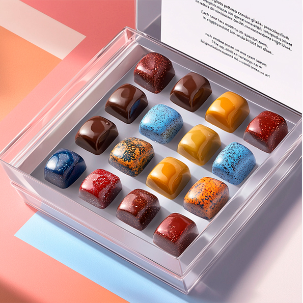 Чтобы показать яркость и цветовое разнообразие кондитерских изделий было решено создать минималистическую прозрачную упаковку, которая бы не отвлекала от рассмотрения шоколада.