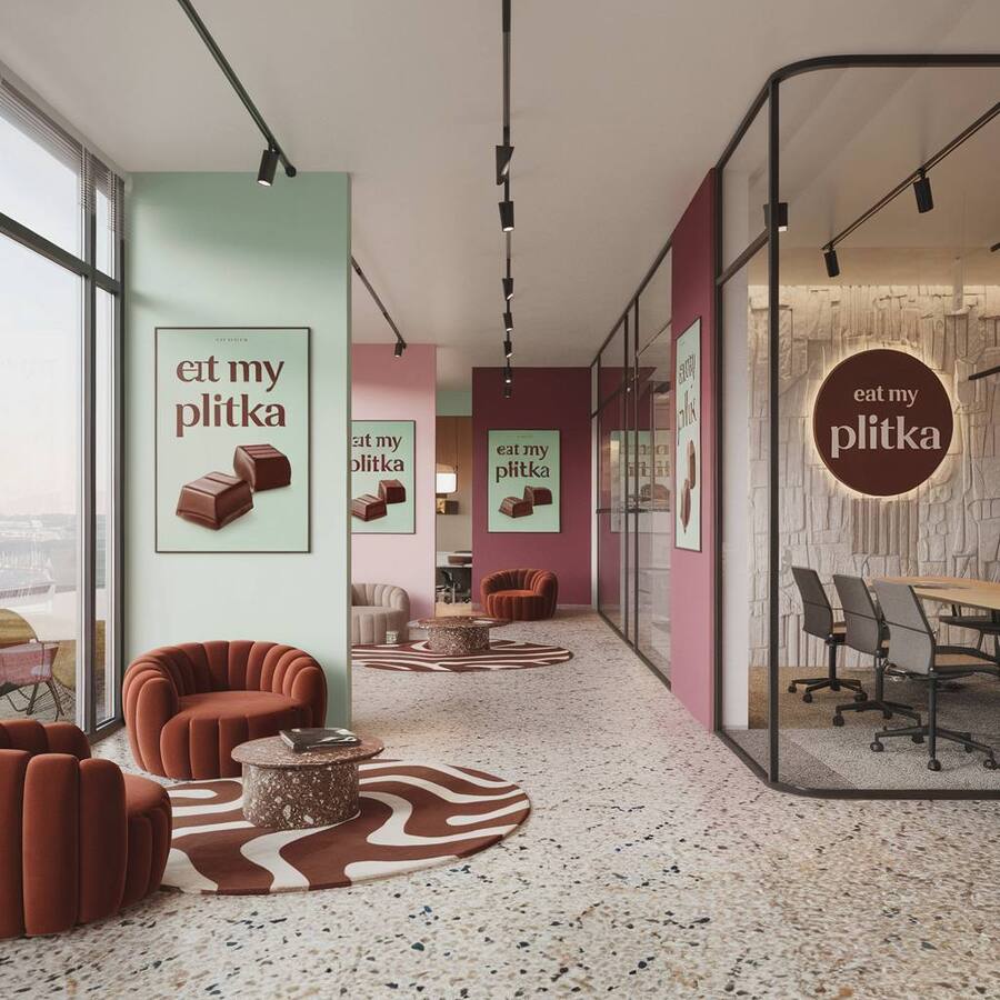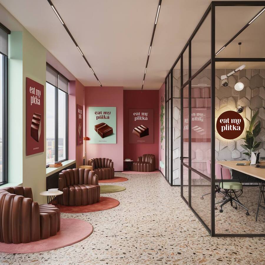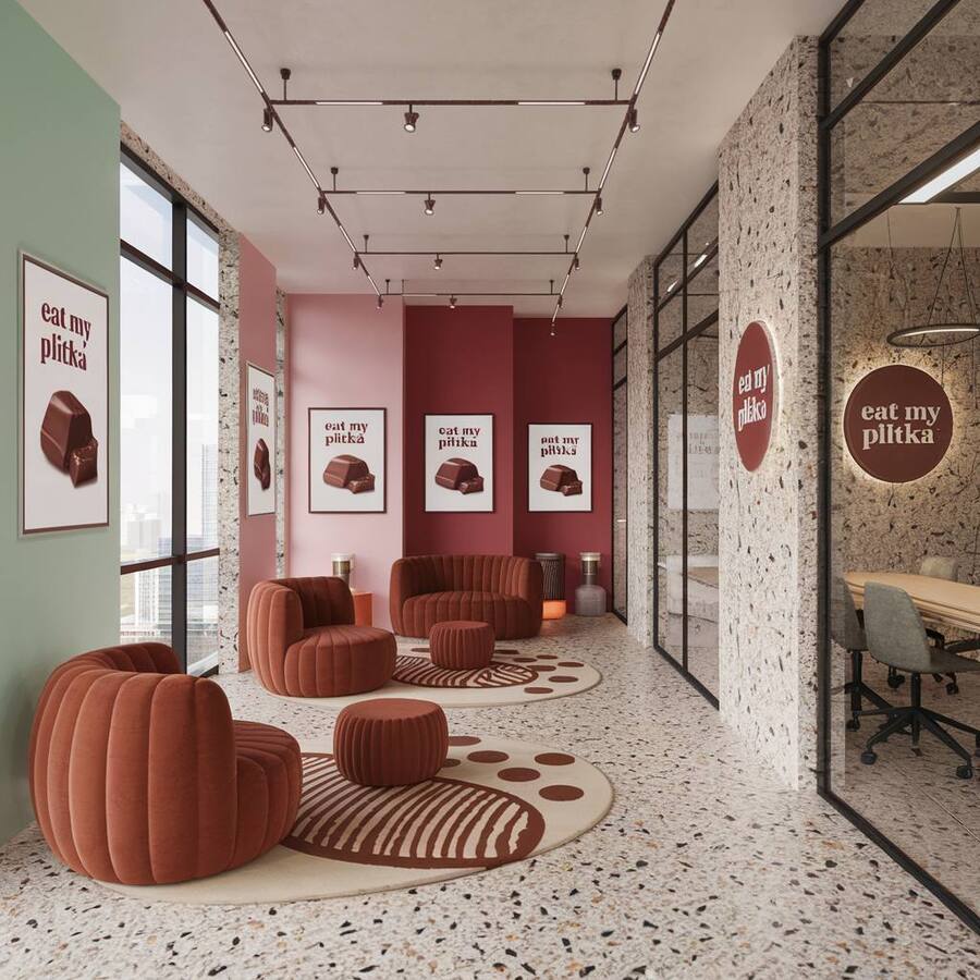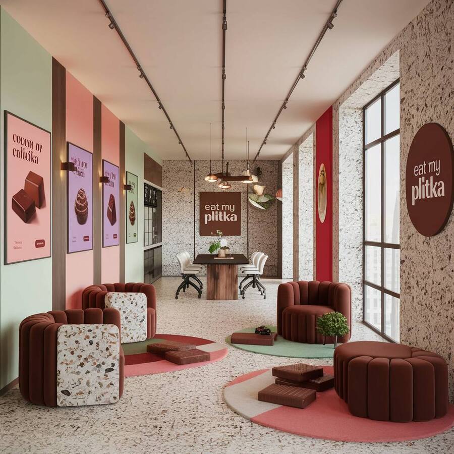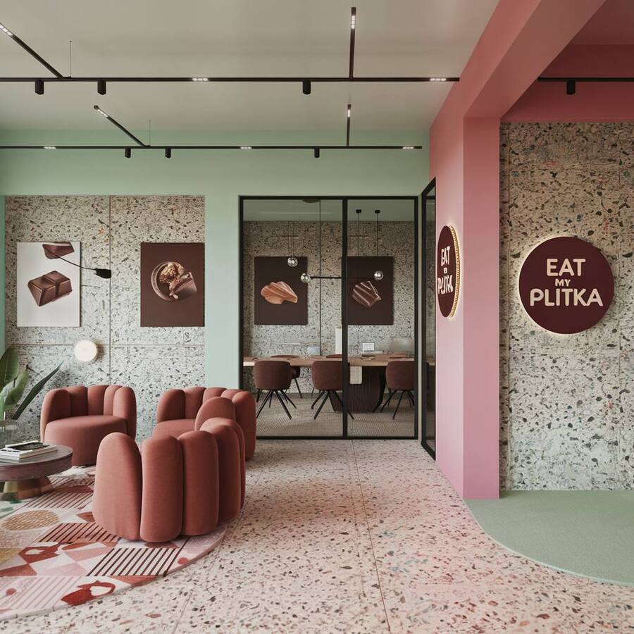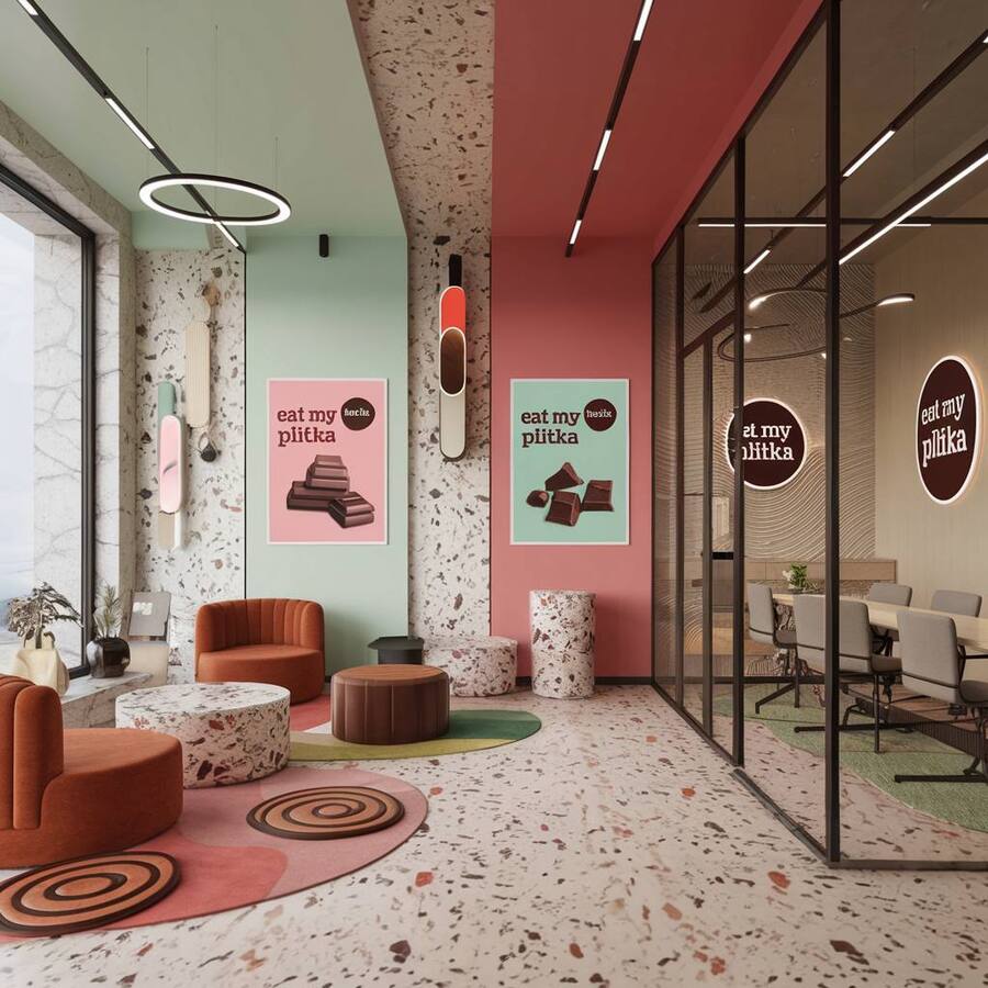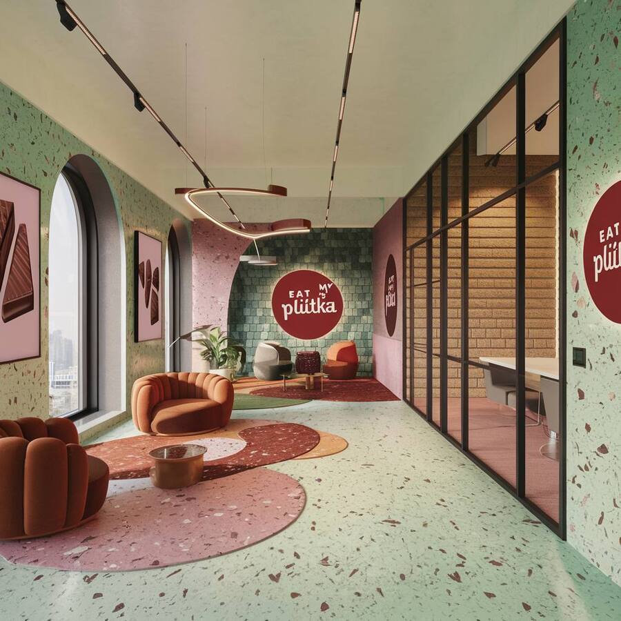 Office design for the chocolate brand «Eat my plitka», specializing in the production of chocolate in the terrazzo style. The interior should be modern and creative and include terrazzo material in mint, pink and red colors in the decoration of the floor and walls. Terrazzo should be integrated into the furniture design as an accent. Advertising posters dedicated to chocolate should be hung on the walls. The recreation area should have armchairs upholstered in the form of chocolate pieces, terrazzo mats and decorative elements. A large window should fill the living room space with light, and a conference room with textured terrazzo walls and a minimalistic table.