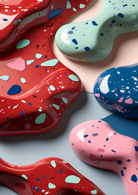 Amorphous chocolate shapes in the form of glossy accent terrazzo of red, mint, pink, blue colors placed on top of each other in a group. The background is pastel.