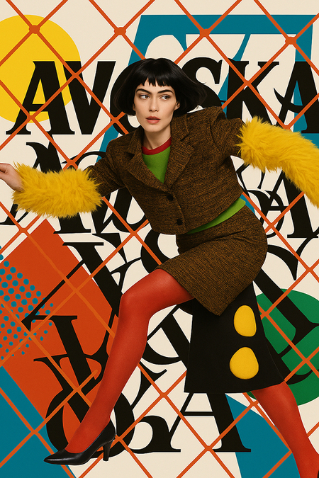 слайд 3 Posters, font posters, the font is scattered on the background, a grid is stretched over the posters. The composition contains clothes in the retro style of the 90s. Elements with a muted color palette of the 80s and 90s. Pop art style, realistic processing, uniform lighting, white or neutral background.