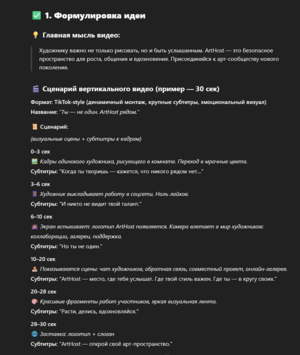 Первый вариант сценария был сгенерирован с помощью ChatGPT, после того, как я внесла промпт: «Помоги мне написать сценарий промо-ролика для моего проекта ArtHost. Ролик должен быть недлинным, визуально понятным для зрителя и увлекающим.»