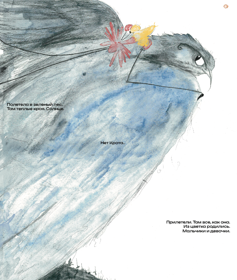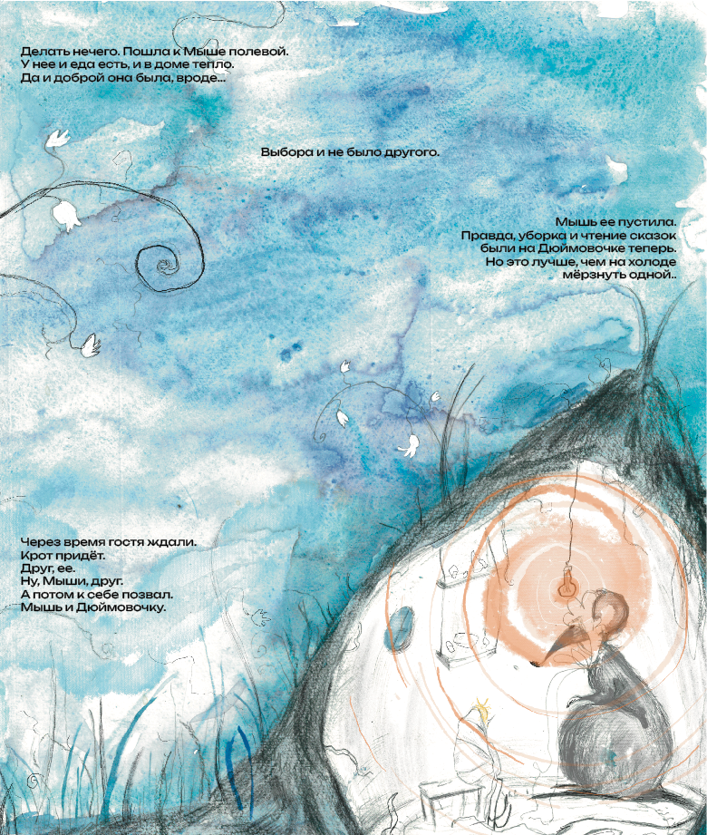 Серия иллюстраций к сказке «Дюймовочка», в основе которой лежит мысль, что не смотря на трудности и несправедливость, нужно бороться и не сдаваться ради своего счастья.