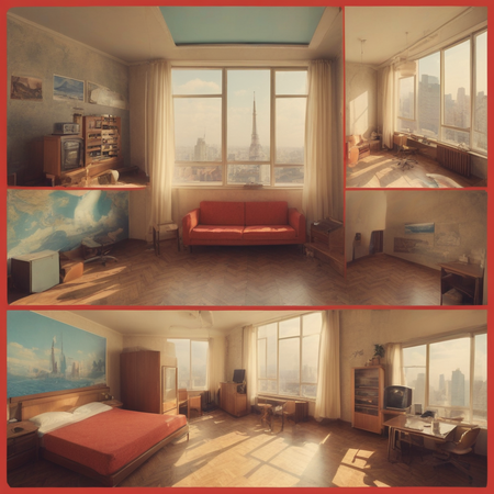 Изображение вновь показывает отличную передачу советского стиля, но есть ощущение, что если использовать в промте «photo collage», появляется больше объектов, хоть и не фотографии как на примере со спальней, но это создает шум, поэтому опустим «photo collage» в последующий промтах.