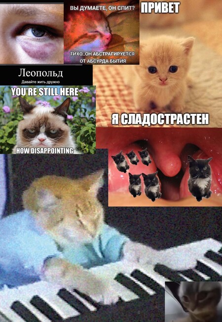 Нарратив идет через краткую историю мемов, большая часть из которых связана непосредственно с котятами, как символа милоты. В противопоставление к ним я взяла фото жутких болезней в открытых источниках интернета. Многие люди, почувствовав недомогание, вбивают в поисковик свои симптомы, а взамен получают страшные диагнозы. Утешить их сможет только пушистый котёнок.