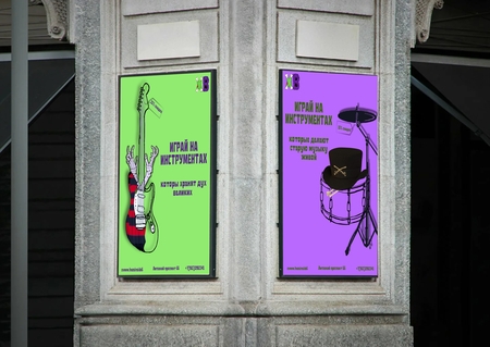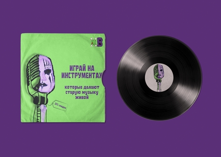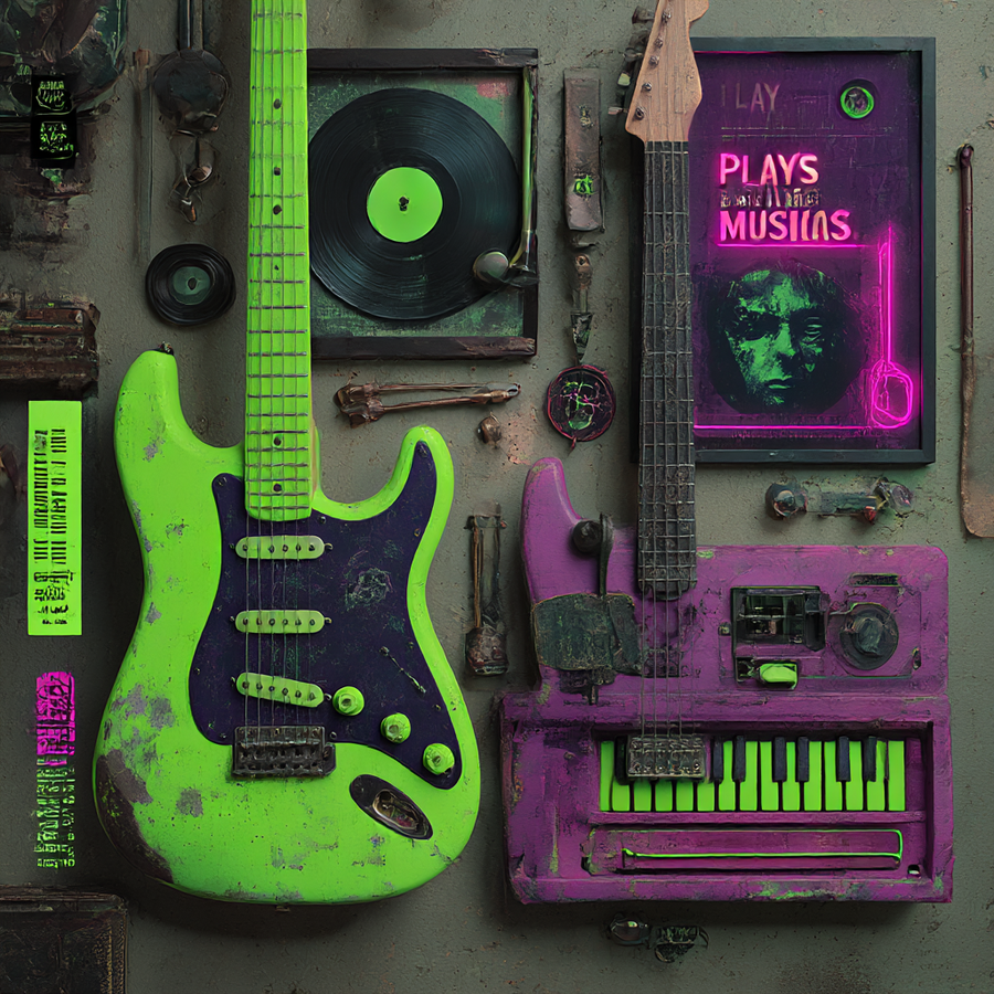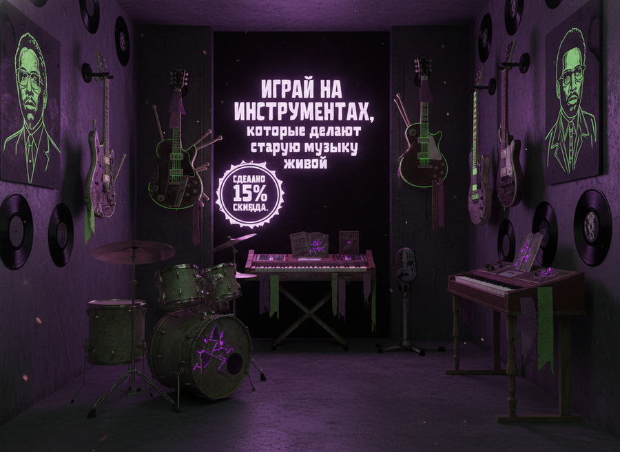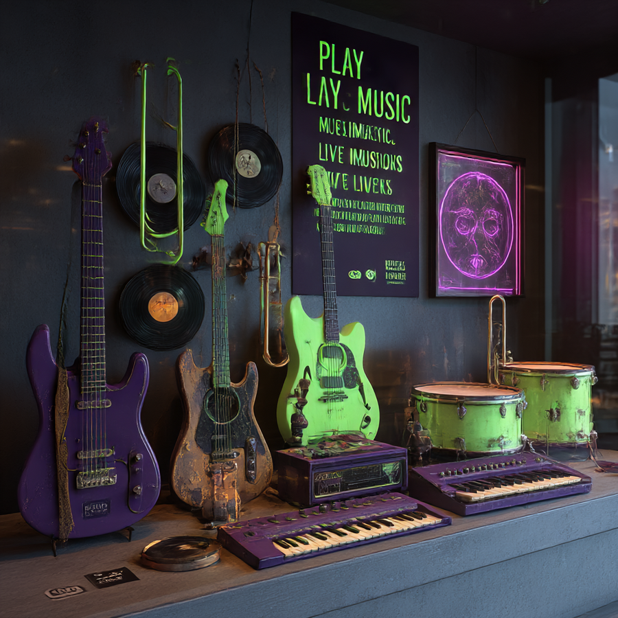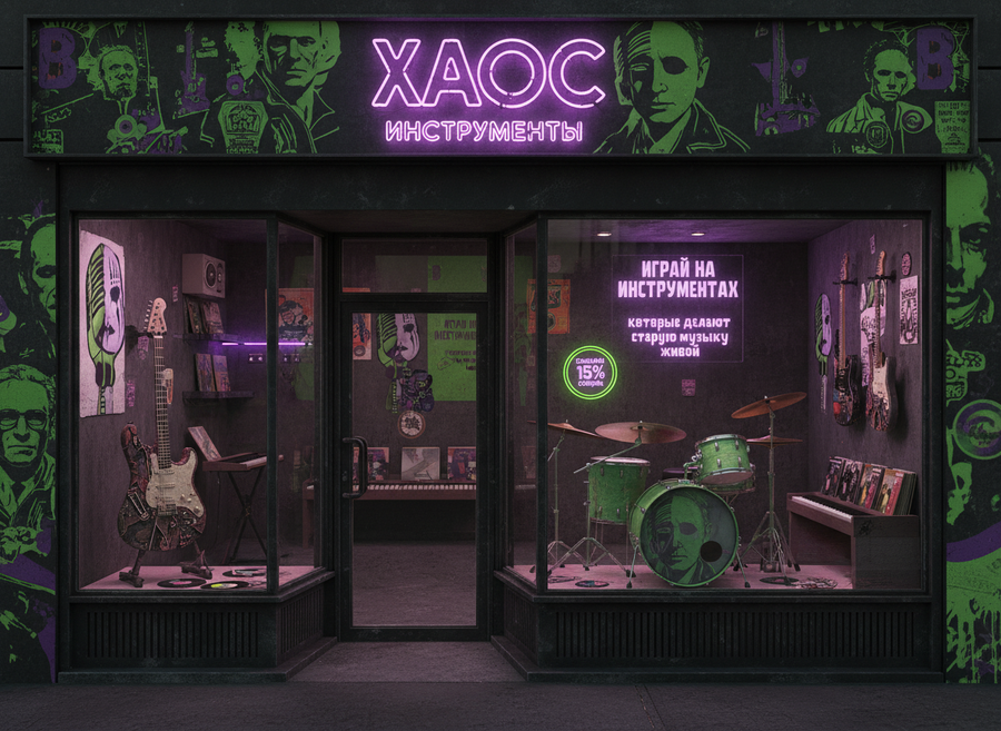 ПРОМТ: Create a concept store of musical instruments made from things and materials owned by deceased legendary musicians. The atmosphere should be mystical, a little dark, but inspiring — as if the spirit of old music comes alive in new instruments. Use a color palette: bright neon green and deep purple, like on the cover of vinyl. These colors create a sense of contrast between life and memory, energy and shadow. In the interior — old guitars, drums, microphones and keys, which seem to be reborn: in their design you can see traces of time — scratches, vintage elements, pieces of leather, metal, fabric. Add symbolism — vinyl records, neon signs, abstract portraits of musicians without faces. On the wall there is an inscription in the spirit of retro posters: «Play instruments that make old music live» Fonts are bold, geometric, with a scuffed effect. Add a small tag or badge: «Made of legend. 15% discount»