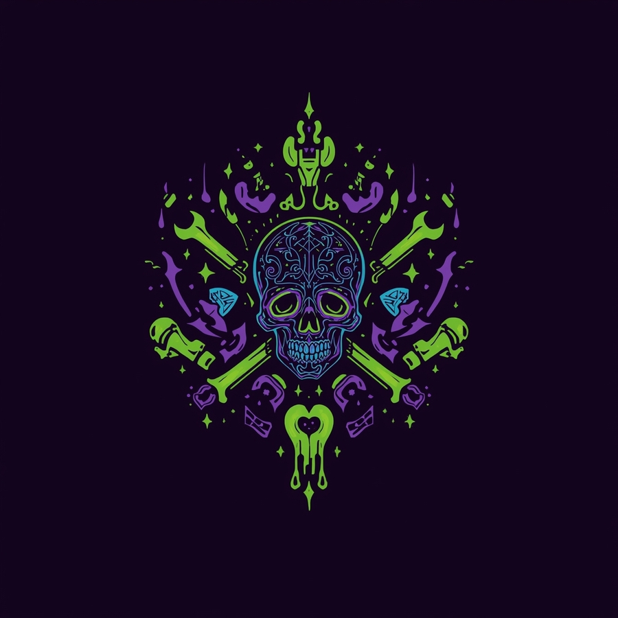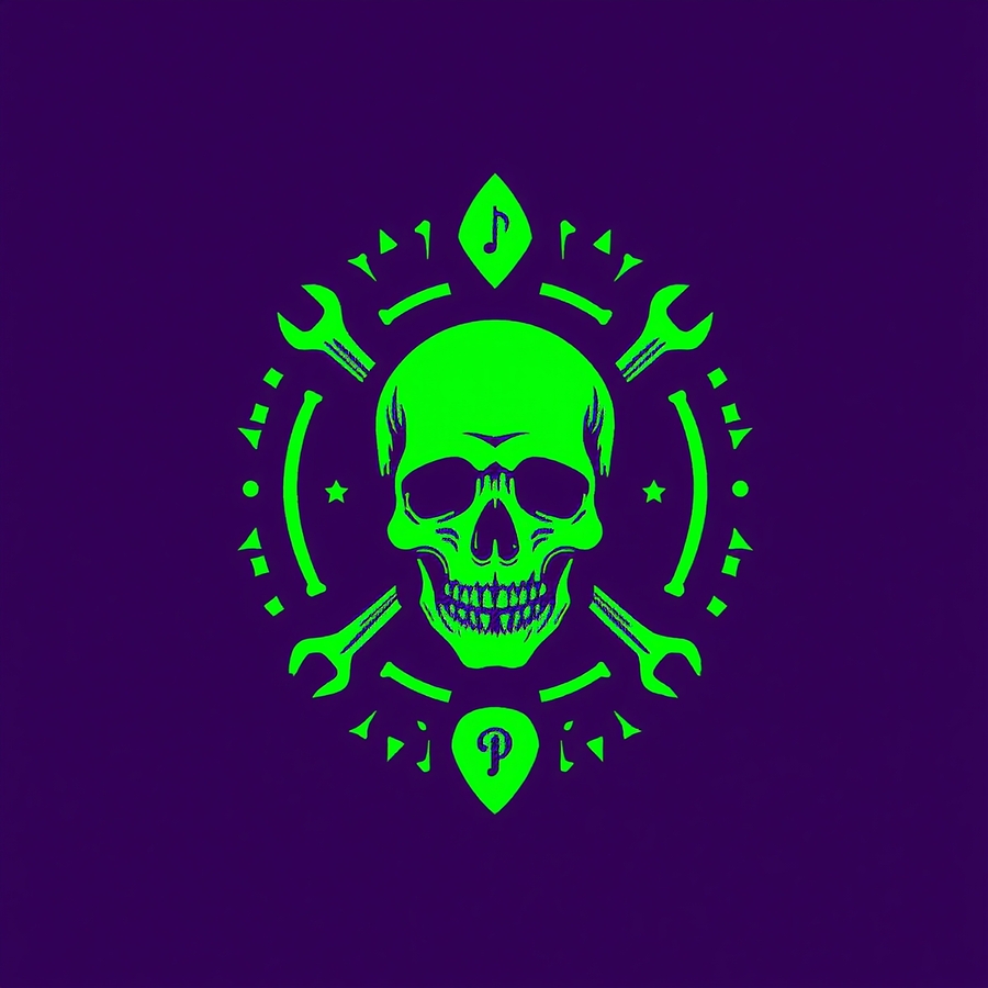 ПРОМТ: Logo design for a unique tool shop that sells instruments crafted from materials and belongings of legendary deceased musicians. The logo should combine deep purple and bright neon green as the main color palette. Style: mysterious, rock-n-roll, slightly gothic with a hint of fantasy. Elements: subtle bones or skeletal motifs (for example, a bone wrench or skeletal guitar neck), stylized musical symbols (guitar pick, strings, notes). Composition: modern, symmetrical, bold typography, easily readable in print and digital formats. Atmosphere: mystical, artistic, and rebellious — reflecting the spirit of immortal music and craftsmanship from another world. Keywords: deep purple and neon green color scheme, skull-inspired ornament, bones, tools, music, gothic modern logo, vector, clean design.
