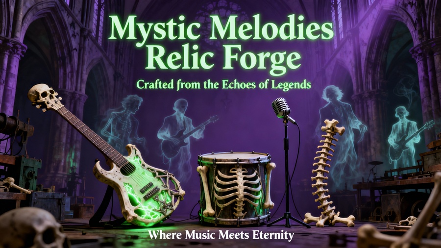 ПРОМТ: Poster design for a mysterious music instrument shop that crafts instruments from the belongings and materials of deceased legendary musicians. The color palette: deep purple and bright neon green, with glowing accents and dramatic lighting. The poster should feature: — ghostly or ethereal silhouettes of famous dead musicians (no direct likenesses, only symbolic or shadowy figures), — musical instruments made from bones, skulls, and old relics, — surreal and gothic atmosphere, like a blend of a music cathedral and a haunted workshop. Include skeletal or bone motifs intertwined with instruments — for example, a bone guitar, drum made of ribs, or a mic stand shaped like a spine. Style: dark fantasy, neon gothic, cinematic lighting, high detail, otherworldly aura. Composition: dramatic focus on instruments, subtle ghostly presence of musicians, glowing typography.