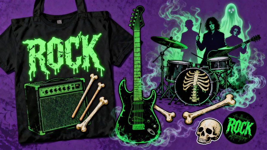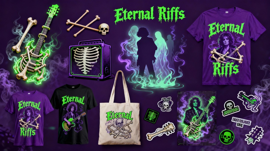 ПРОМТ: Merchandise design collection for a music instrument shop that creates instruments from the belongings and materials of legendary deceased musicians. Concept: fusion of music, death, and art — powerful, mysterious, rebellious. Color palette: deep purple and bright neon green, glowing and contrasting. Include: — stylized bones or skeletal motifs (for example, bone guitar necks, skull drumsticks, ribcage-shaped amps), — ghostly silhouettes or abstract representations of famous dead musicians (symbolic, not realistic portraits), — musical instruments intertwined with bones, smoke, or spectral light. Style: neon gothic, dark fantasy rock aesthetic, surreal and artistic. Suitable for T-shirts, hoodies, tote bags, posters, stickers. Typography: bold, distressed rock fonts glowing in neon green, set against deep purple backgrounds. Atmosphere: mystical, underground, spiritual rock rebellion.