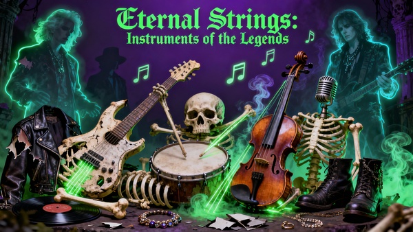 ПРОМТ: Create hyper-detailed product concept designs for musical instruments crafted from the belongings and materials of legendary deceased musicians, displayed as exclusive items in a mystical rock-themed shop. Concept: fusion of music, death, legacy, and craftsmanship — instruments built from the relics and possessions of rock icons, each piece carrying the spirit of its musician. Main colors: deep purple and bright neon green — glowing, surreal, mystical contrast. Include: — Guitars with bone fretboards, vinyl fragments embedded in the body, leather straps from old jackets. — Drum sets built from skulls, ribs, and brass fused with cracked leather. — Microphones wrapped in silver chains, rings, or jewelry that once belonged to musicians. — Violins and basses featuring ghostly neon veins and engraved signatures of legends. — Ghostly aura or spectral light surrounding instruments — symbolic of the musicians’ souls. Materials & textures: aged metal, cracked vinyl, bone, leather, neon light reflections, smoke, energy trails. Presentation: cinematic product photography style — studio lighting, dark background, glowing neon highlights, spiritual atmosphere. Style: dark gothic neon, cinematic realism, fantasy craftsmanship, surreal detail.