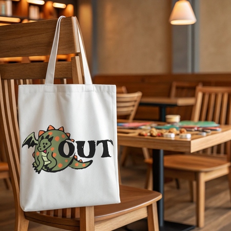 Промпт: Create a logo for a board game-themed anti-café called «OUT». Include a friendly cartoon dragon as the main mascot (green dragon with orange spots and small black wings). The logo should combine playful fantasy vibes with cozy, welcoming café energy. Use warm tones like green, orange, brown, and beige. Style: modern, flat, minimalistic, and suitable for branding and signage. Place the word «OUT» clearly, integrated with the dragon character.