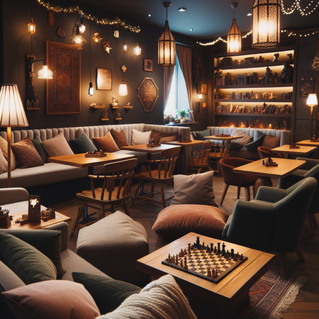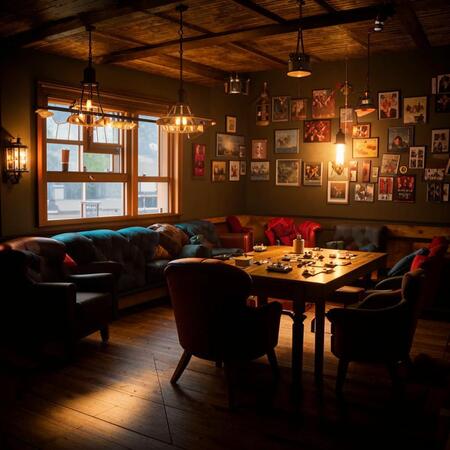 Интерьер OUT обволакивает теплом: мягкие диваны и кресла окружают массивные деревянные столы. Приглушенный свет от стильных ламп и уютных гирлянд создает атмосферу полумрака, идеального для погружения. Стены в спокойных, глубоких тонах украшают полки с играми и фэнтезийными артефактами, а обилие мягких подушек и пледов приглашает расслабиться и остаться надолго.