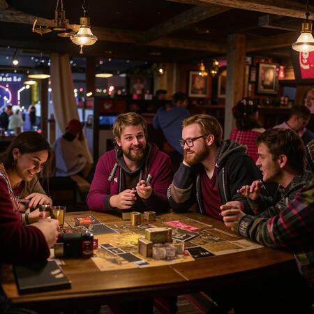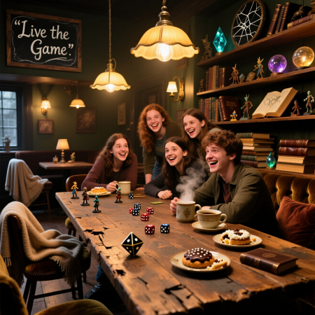 В уютном антикафе люди не просто играют — они по-настоящему живут моментом. За массивными деревянными столами, в уютном полумраке, разворачиваются эпические Dungeons & Dragons кампании: слышен грохот бросаемых костей, вдохновенные рассказы мастеров, оживающие в голосах персонажей, и заразительный смех друзей, которые вместе преодолевают опасности. Лица сосредоточены в предвкушении хода, а потом озаряются ликованием победы или забавно морщатся от неожиданного поражения. Чашки с ароматным чаем и кофе всегда полны, легкие закуски и сладости под рукой, поддерживая энергию для долгих игровых сессий. Здесь, окруженные фэнтезийными артефактами и обилием мягких подушек, гости обмениваются шутками, делятся тактиками и создают новые воспоминания, забывая о внешнем мире. Каждое посещение OUT — это не окончание игры, а лишь пауза до следующего приключения, наполненного весельем, стратегией и искренним общением.