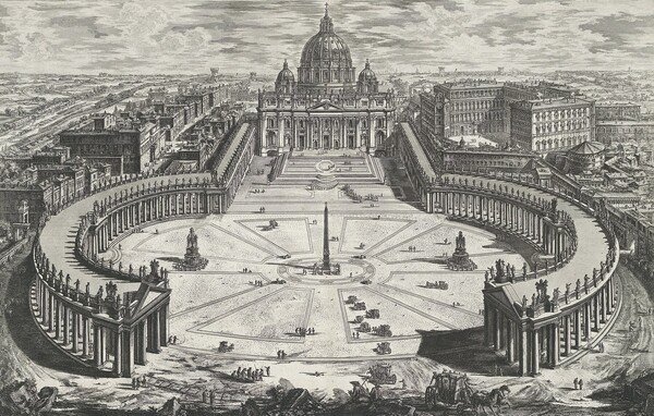 Эскиз для проекта площади Святого Петра / Дж. Л. Бернини / 1650-е гг. Вид площади Святого Петра из серии «Виды Рима» / Дж. Б. Пиранези / 1760-е гг.