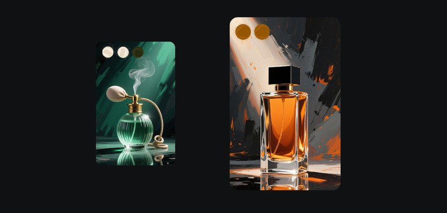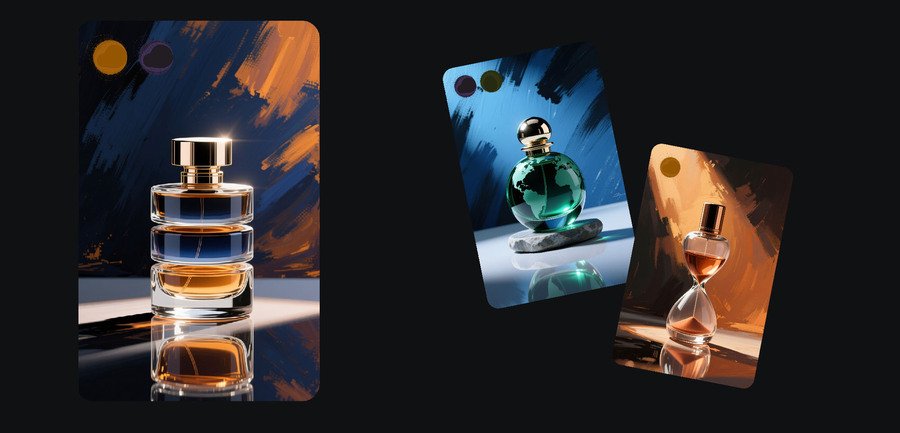 Общий промт: Design: digital painting, painterly brushstrokes, high-contrast cinematic lighting, dramatic chiaroscuro, minimalistic composition, single perfume bottle centered on a small reflective surface, strong directional spotlight with soft rim light, expressive textured background made of broad brush strokes, bold but limited color palette (one dominant hue + dark neutrals), subtle reflections on surface, slight painterly grain, hand-painted look, elegant editorial aesthetic, clean negative space, no extra props unless specified, maintain consistent visual weight across cards