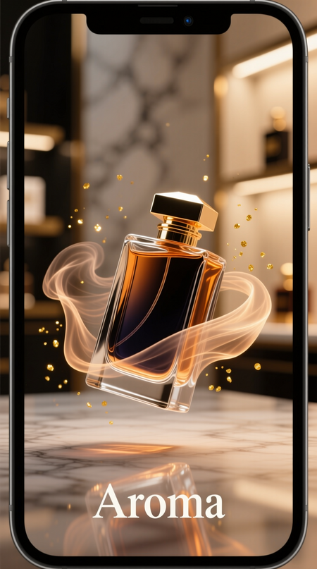 Exhibition pop-up stand concept for the perfume board game «Аroma», designed like a luxury perfume boutique: glass display cubes containing the illustrated cards and bottles, ambient warm light, deep black walls with gold foil logo «Аroma», elegant signage in Didot type, scattered petals or light mist around the display, premium visual merchandising style, realistic photography, high detail, no visible grid or repeating textures.