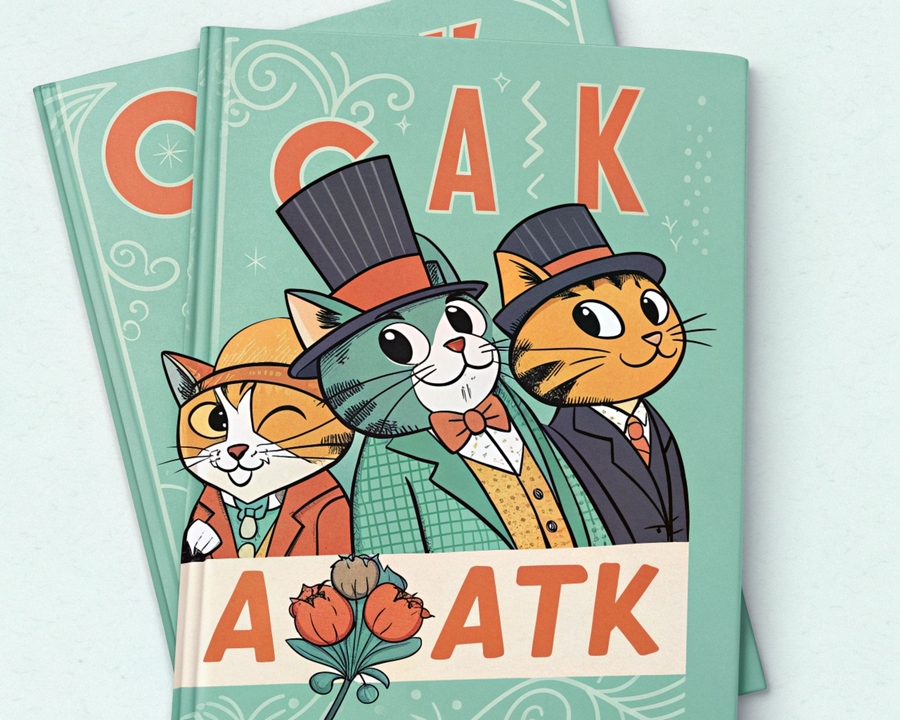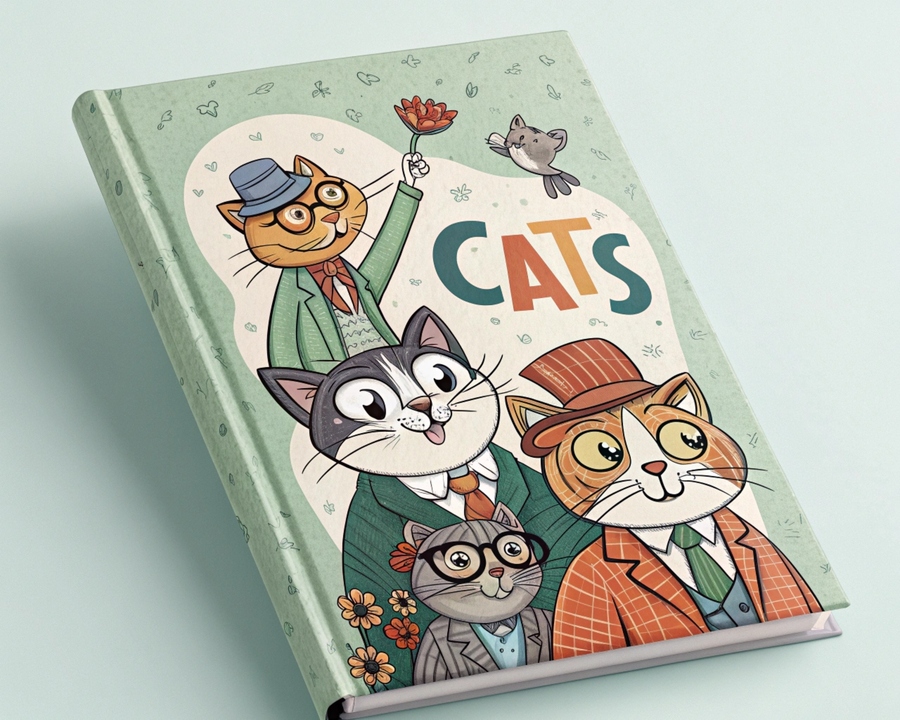 The third prompt: A comic book with image on it’s cover. This image features a vibrant and artistic cover design set against a light mint-green background. The central focus is a cluster of anthropomorphic cats, drawn with expressive and lively detail, each showcasing unique personalities and dressed in distinctive attire such as suits, hats, and accessories. The cats appear to represent a variety of characters, creating a sense of story or community. Above and around the illustration, large, colorful Cyrillic text in blue, green, and orange conveys a playful title or phrase, adding to the whimsical tone. The bottom of the illustration incorporates stylized lettering with a stitched, patchwork effect, complementing the cozy and handcrafted feel of the artwork. The design suggests it could be a book cover, poster, or part of a creative project with a lighthearted and engaging narrative.