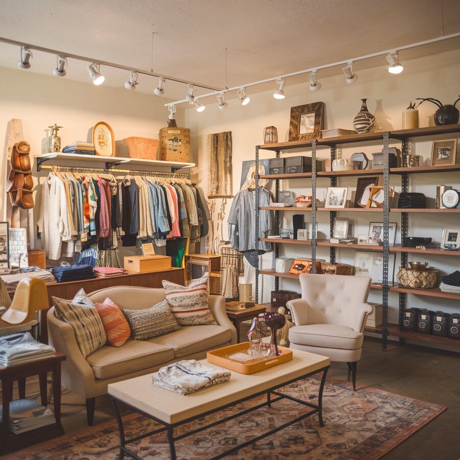 Prompt: Renewed Treasures is a charming second-hand store that embodies the idea of giving pre-loved items a fresh start. The shop is designed to feel inviting and warm, with neatly organized displays of curated treasures. Whether you’re searching for vintage furniture, gently used clothing, rare collectibles, or unique home decor, Renewed Treasures offers a diverse selection of high-quality items that have been carefully cleaned, restored, or repurposed.