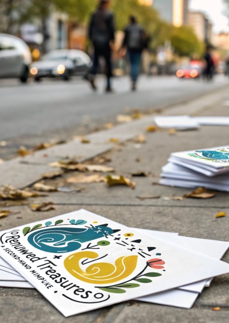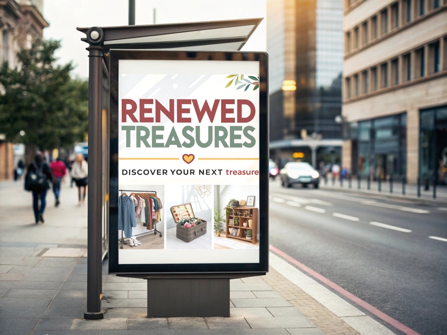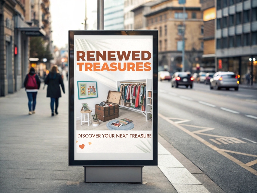 Prompt: A poster on the street advertising a secondhand store named «Renewed Treasures»