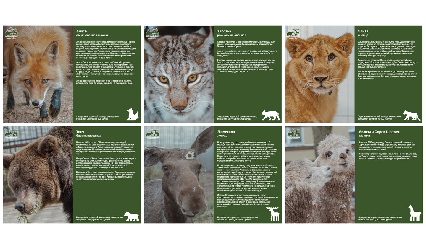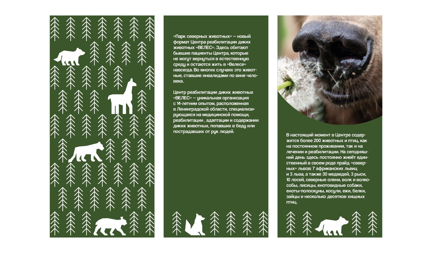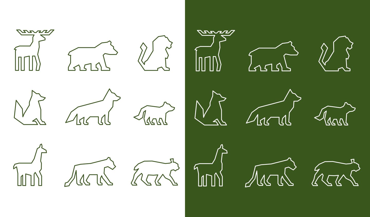 Фирменный стиль парка основан на пиктограммах животных. Парк располагается в большом хвойном лесном массиве, поэтому, так же были добавлены пиктограммы елок. Животные и елки «живут вместе» в фирменном стиле. Они будто гуляют в густом хвойном лесу, образуя паттерны, которые используются на всех носителях.