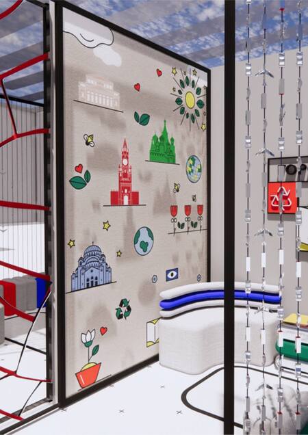 Основной элемент стенда — зеркало в форме карты Москвы, которое выполняет две функции: является фотозоной и картой одновременно. Двойной функционал достигается благодаря выдвижной ширме, на которой изображены достопримечательности столицы. Вторая ширма представляет собой металлические бусины в виде транспорта и является фотозоной и разграничивающим элементом.