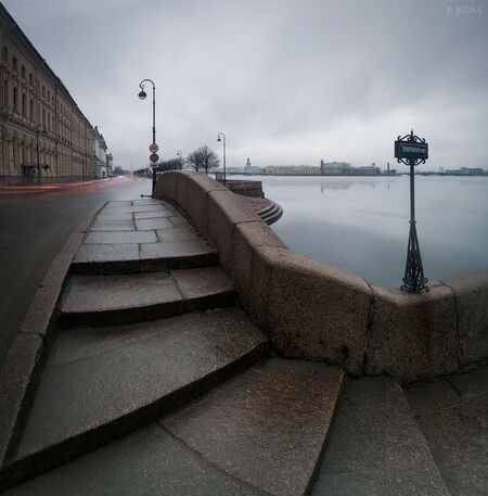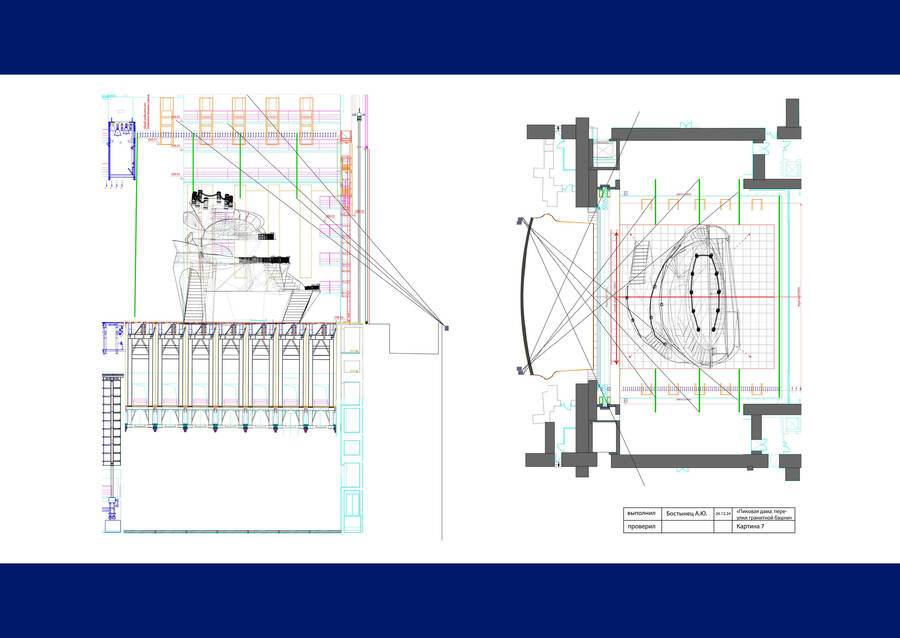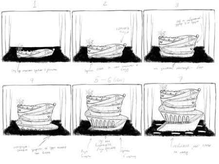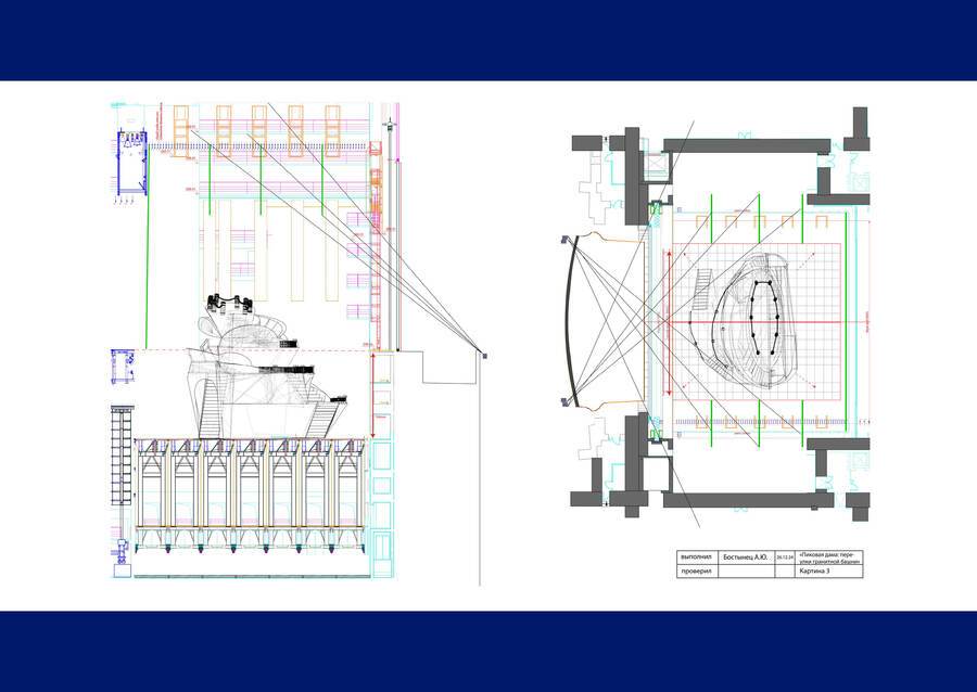 От действия к действию, от картины к картине — Герман спускается по воронке набережных все ниже к пропасти, однако не может этого заметить: «Башня» с каждой картиной поднимается все выше из трюма. Таким образом, несмотря на физический спуск, тело актера остается на одном и том же уровне, что символизирует эмоциональное и психическое состояние Германа. Он сам топит себя все глубже в черной мутной воде Нивы, но не может этого понять