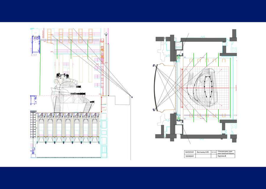 Опера П. И. Чайковского сюжетно сильно отходит от первоисточника, превращая светский анекдот в историю о личных трагедиях. Больше всего это чувствуется в перонаже Германа. Если в оригинальном сюжете зрители наблюдают:, как он постепенно начинает сходить с ума, то в опере просто напросто не существует сюжетной точки, в которой с Германом все в порядке: он сначала сходит с ума от любви к Лизе, а потом — от желания узнать секрет графини и разбогатеть. При разработке концепции для своей сценографии я выбрала, как ключевой, именно этот факт постоянства безумства Германа, стремясь показать, что он заперт в этом цикле из двух безумий. Так, было решено использовать структуру и визуальный образ воронки кругов ада из «Божественной комедии» Данте. Герман совершает путь по воронке вниз, пока обитатели каждого из кругов разыгрывают для него события, которые привели к его безумству и гибели