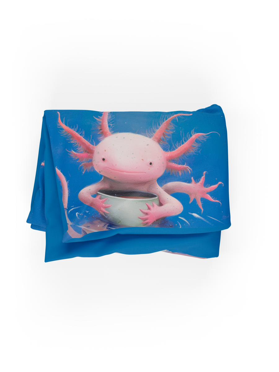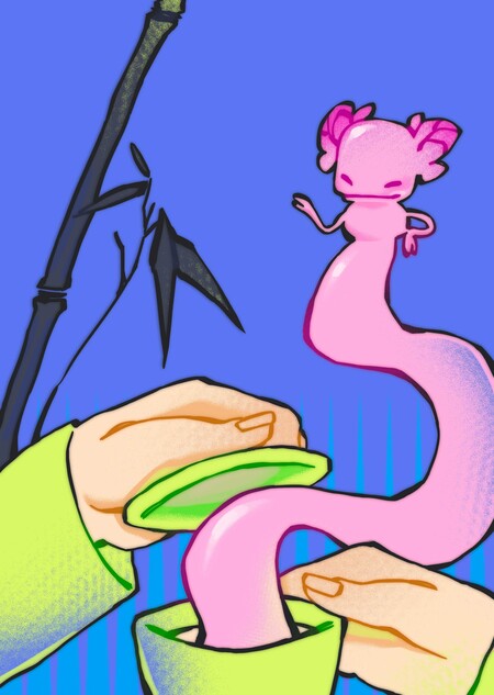 Промт: аксолотль, синий фон, чашка чая, дух. Инструменты: НейроХолст, Photoshop.