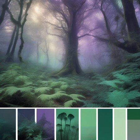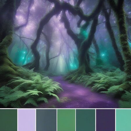 Color palette: shades of lavender, deep emerald green, moss green, muted turquoise, smoky blue, silver mist, and soft golden light. A mystical fairy-tale forest glowing with ethereal light, filled with purple-green mist and gentle sparkles drifting through the air. The trees have tall, twisting trunks with iridescent moss, and the forest floor is covered in glowing ferns and flowers that emit soft hues from the color palette. Shafts of light filter through the canopy, creating a sense of magic, depth, and wonder. The atmosphere feels enchanted and serene, as if time moves slowly here. High detail, cinematic lighting, and painterly realism — evoking the feeling of a dreamlike enchanted forest where nature itself feels alive.