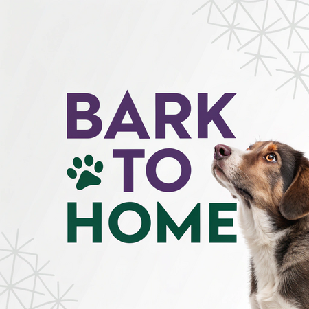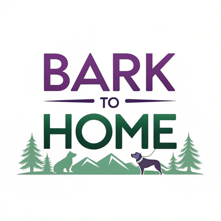 A logo for an animal search company called «Bark to home». The logo features an Isabella dachshund. The palette is greenish-purple and smoky