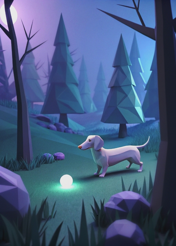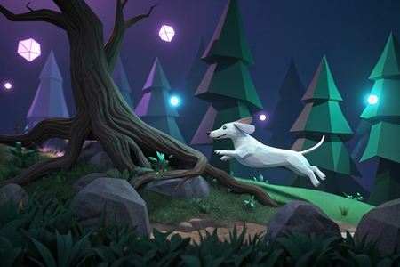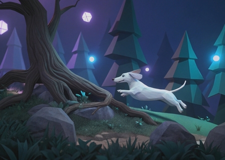 A white dachshund running through a dark, lowpoly 3D forest. The scene shows the dog mid-jump over twisted tree roots on the forest floor. The environment is made of angular, polygonal shapes with stylized trees and rocks, illuminated by soft green and purple-blue lighting. The atmosphere feels slightly mysterious yet playful, with motion blur and dynamic lighting emphasizing the dachshund’s movement. The overall style is lowpoly 3D game art with sharp geometry and a cinematic sense of motion.