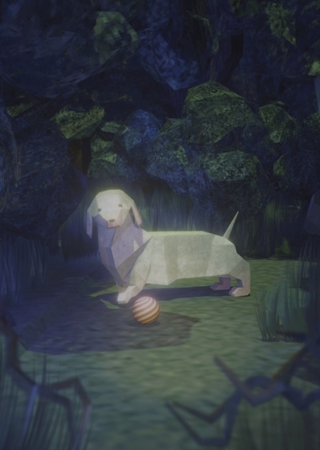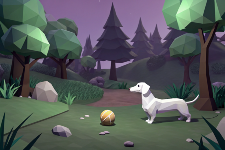 A 3D lowpoly game scene featuring a white dachshund standing in a stylized forest. The environment has angular, polygonal trees, rocks, and grass with greenish tones and a subtle purple-blue lighting that creates a calm, moody atmosphere. The dachshund is illuminated softly, facing a small ball in front of it that has a bright white outline. The art style is distinctly lowpoly with sharp, angular geometry and soft, diffused lighting for a slightly dreamy, game-like look.