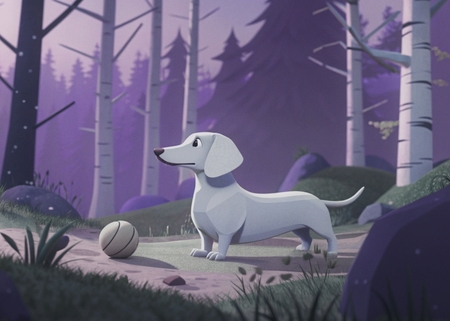 A stylized frame from a 3D low-poly video game. A white low-poly dachshund stands in an ordinary forest with birches, firs, and oaks, along with rocks and patches of grass. In front of the dog is a ball with a white outline, reminiscent of a game object. The forest has a subtle magical touch with predominantly purple and green colors, giving a slightly mythical atmosphere. The camera is positioned slightly behind the dog, capturing the scene from a low angle with gentle depth of field, cinematic composition, and soft ambient lighting.