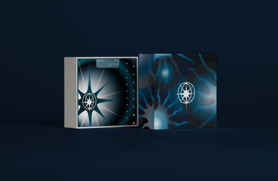 Упаковка была сгенерирована в нейросети Ideogram. Текст генерации: generate packing boxes for the brand of nightlights. The name of the Luminarc brand is written on the box itself in Central Light font. The box itself is transparent, inside you can see a blue-purple abstract night light. The box is located on a cloud against the background of the night sky.