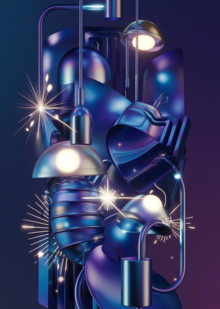 Ночники были сгенерированы в нейросети Ideogram. Текст генерации: A 3D image of a night light with an abstract, unusual shape glowing from the inside. The night light is placed on a dark night cloud. The night sky is visible behind the cloud. The night light is shiny and emits blue and purple shades of light. The background contains stars.