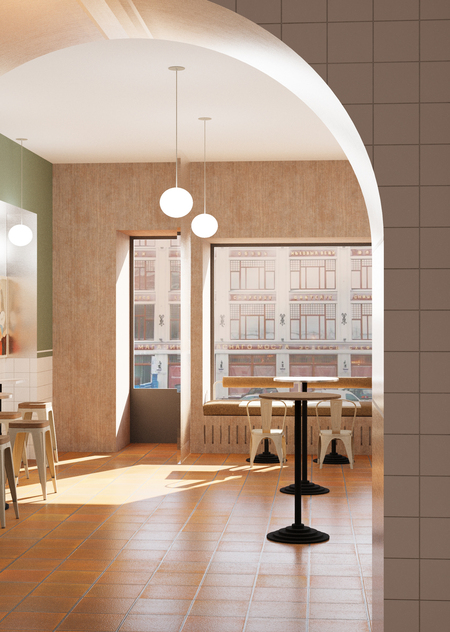 Зонирование помещения предполагает большое количество посетителей и быстрый поток. Из мебели используем высокие разноуровневые металлические подстолья и стулья. В помещении большие окна с низкими, широкими подоконниками, их используем как дополнительное посадочное пространство.