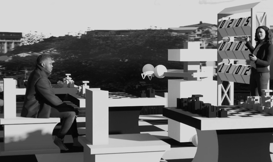 Запрос ChatGPT: Опиши помещение в котором проходят шахматные игры и обучение с доской где написаны тактики и тд. Стена с понорамным окном, за окном город. стены покаршены в белы с яркими картинами шахмат розовых и зеленых. пол в виде шахматного поля.