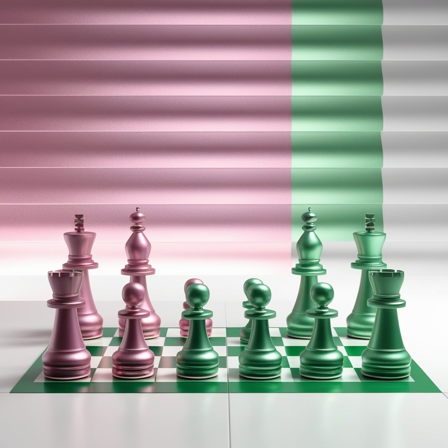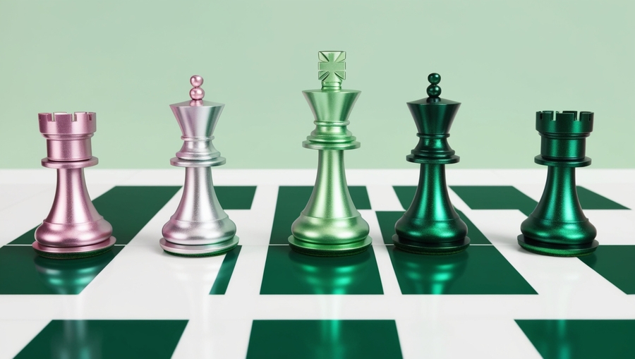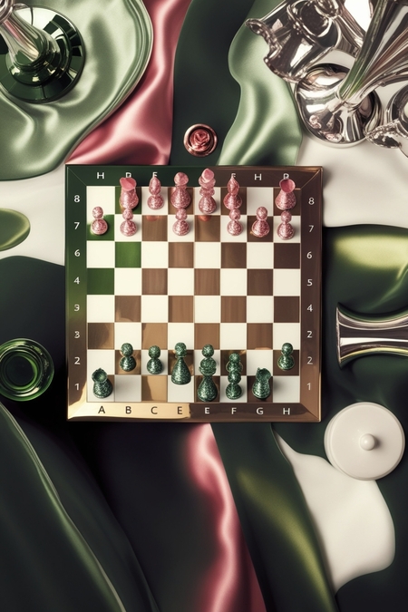 Promt: Generate a set of metal chess pieces, each has a gradient from light pink to dark green and light green to dark green and shimmering. The style is realistic and the chessboard is done in a fresh white and green palette.