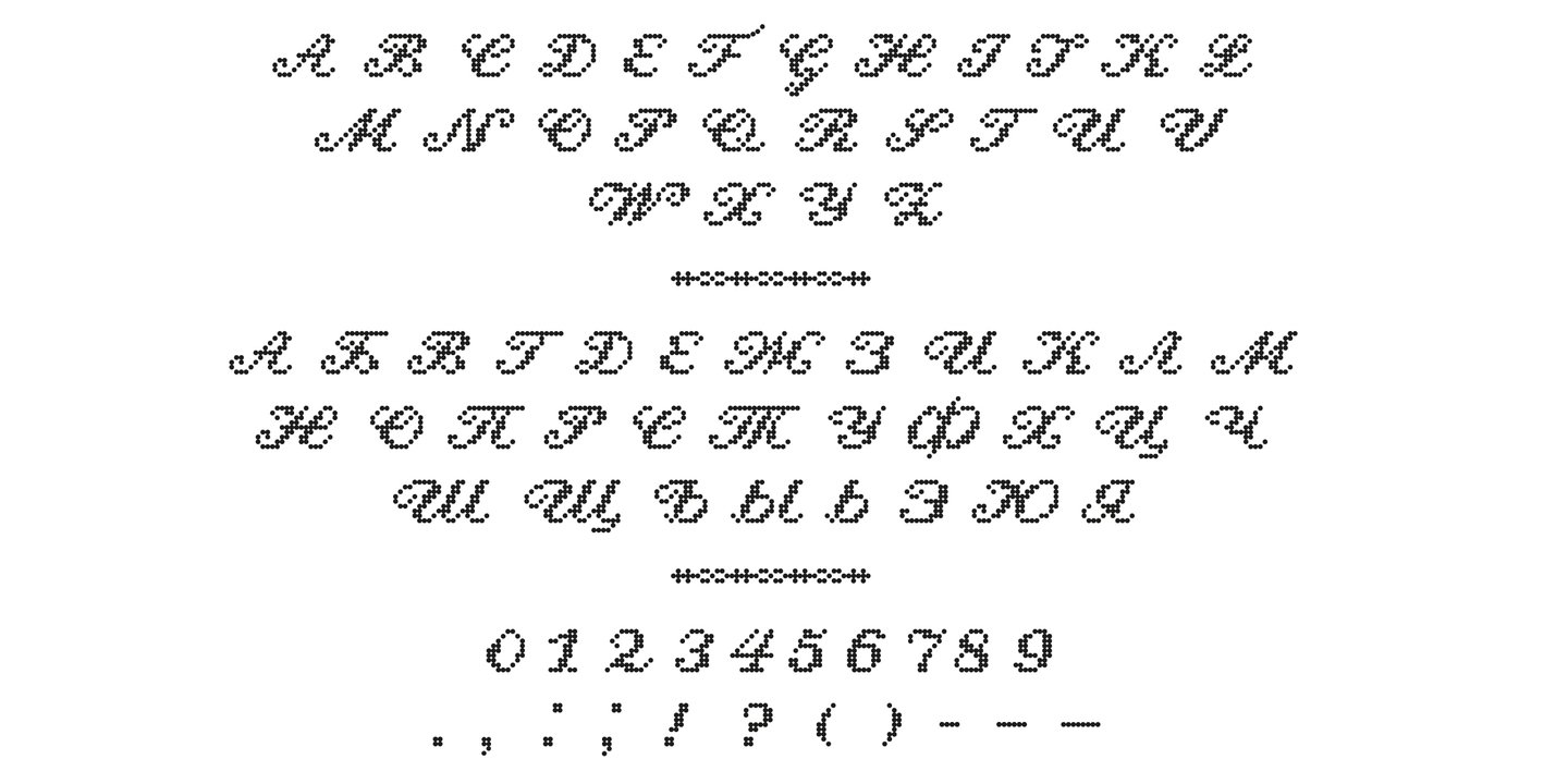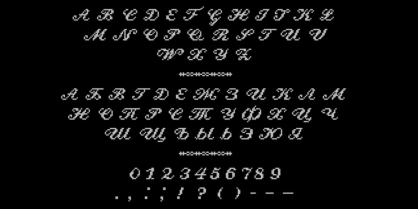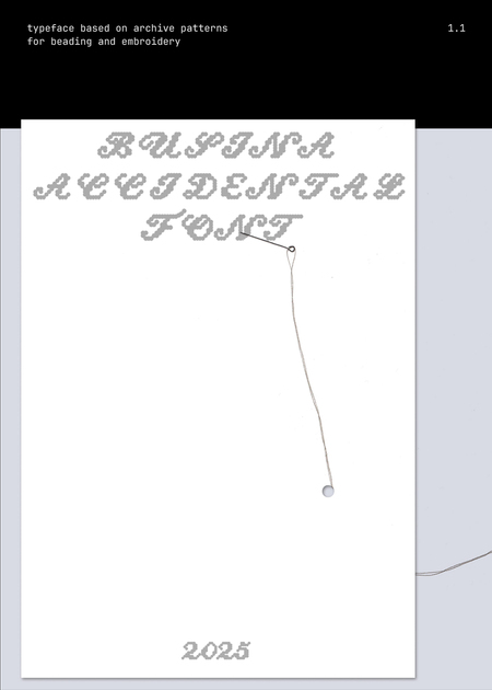 Busina — акцидентный шрифт создан на основе схем для бисероплетения и вышивки, найденных на тематических форумах и в архивах старых журналов. Разлетающиеся буквы и динамичные завитки послужили основой и источником вдохновения для создания ревайвл шрифта.