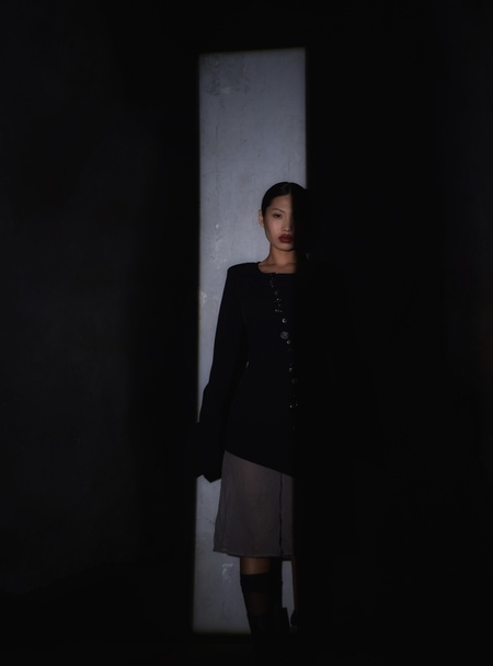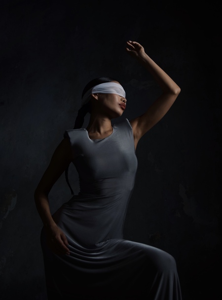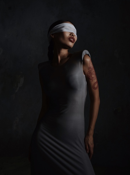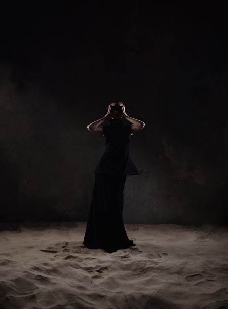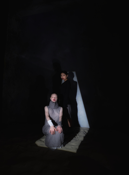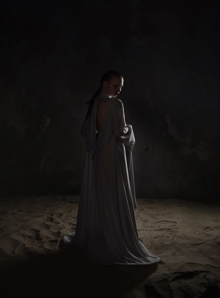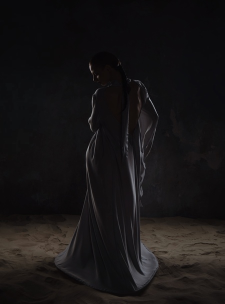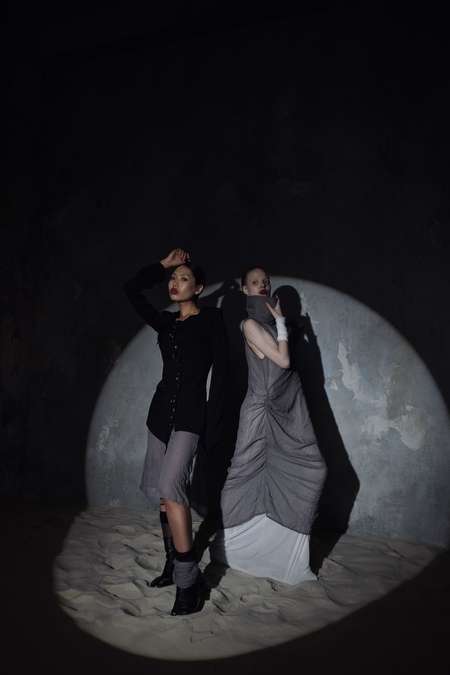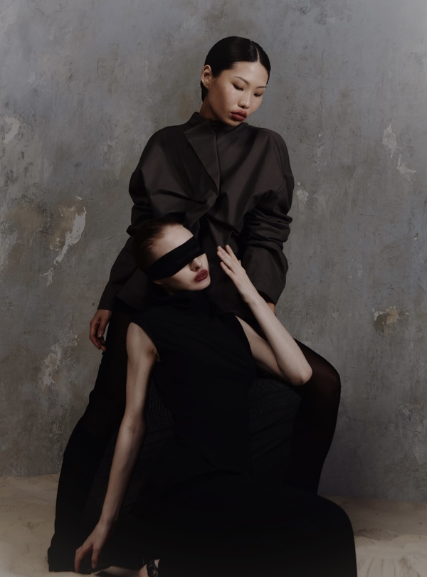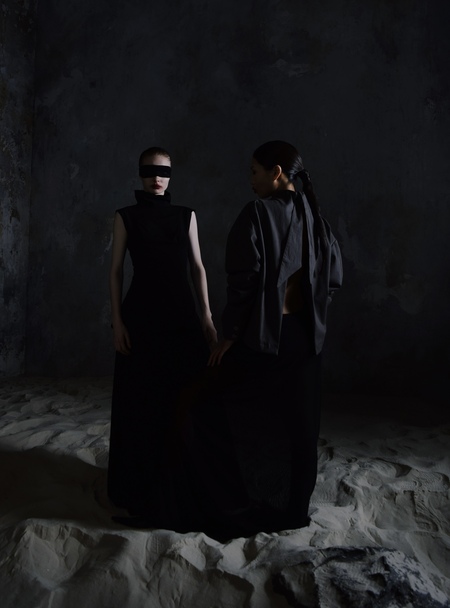 Проект «Югэн: Погружение в Тишину» предлагает зрителю глубокое и сосредоточенное исследование японской философии «Югэн», отражая ее принципы через визуальные образы и символы. Модели, облаченные в минималистичные однотонные костюмы, представляют собой образ тишины и минимализма. Они подчеркивают простоту линий и форм, отсутствие лишних деталей, предлагая глубокое созерцание красоты в скромности и тишине. Повязки на глазах — отказ от внешнего мира, от визуального шума и концентрацию на внутреннем ощущении. Зритель лишен возможности проникнуть глаза модели, что усиливает таинственность и заставляет его погрузиться в созерцание образа. Песок символизирует время, неизбежность перемен, трансформации. Темные оттенки и минимальное освещение усиливают атмосферу тайны и сосредоточенности.