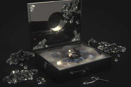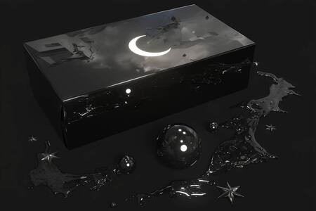 Prompt: Only black and white colours, a 3d render of a mystical packaging box for a witchcraft brand, A 3d render of a mystical packaging box for a witchcraft brand, chromatic y2k style, only black and white colours, realistic mockup.