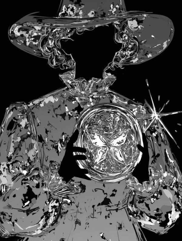 Prompt: a y2k styled image of a chromatic witch holding a magic crystal ball, black and white chrome effect, sparkles, glow, promo poster for a witchcraft shop, witch side profile.