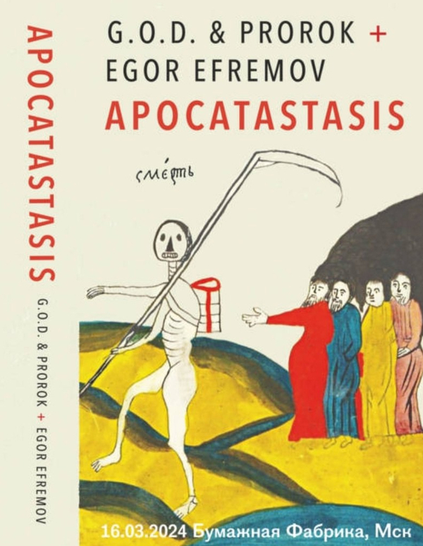G.O.D. & Prorok + Egor Efremov. Сумрачная коллаборация исследователя и практика звука, главного флагмана «Московской Шумовой Мануфактуры» Георгия Орлова-Давыдовского и Дениса Рылова — филолога, литератора и одного из создателей легендарного отечественного проекта «Шумы России», бессменным голосом которого он являлся до распада «классического» состава. Это запись концертного выступления проекта, состоявшегося на восьмом фестивале Only Fetish Fest 16 марта 2024 года. Звуковые ландшафты G.O.D. при поддержке заклинателя терменвокса Егора Ефремова и потусторонняя декламация MC Prorok погружают в бездну и позволяют в истинной мере прочувствовать саму суть понятия «апокалиптический индастриал».