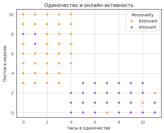 Настало время самого анализа. В современном мире люди очень сильно полагаются на соцсети. Поэтому мне показалось логичным посмотреть, есть ли девиационные моменты в поведении интровертов и экстравертов в сети. Я посмотрела зависимости времени в одиночестве и количества постов в неделю у интровертов и экстравертов. В классических определениях типажей, интроверты должны мало проявлять активность в соцсетях и проводить много времени в одиночестве. экстраверты — наоборот.