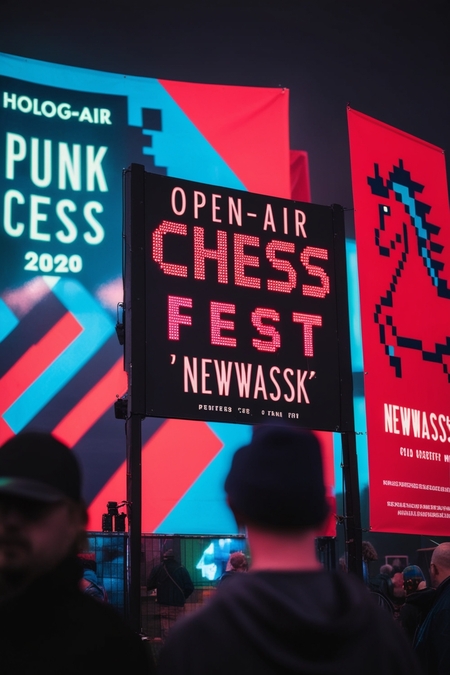Модель: Leonardo Kino XL Пресет: Cinematic Промпт: entrance of open-air punk chess fest «NEWWASSK», vivid cyan red, punk neon signs, cyan red mohawk horse pixel art on signs, 8 bit style posters, foggy deep night sky