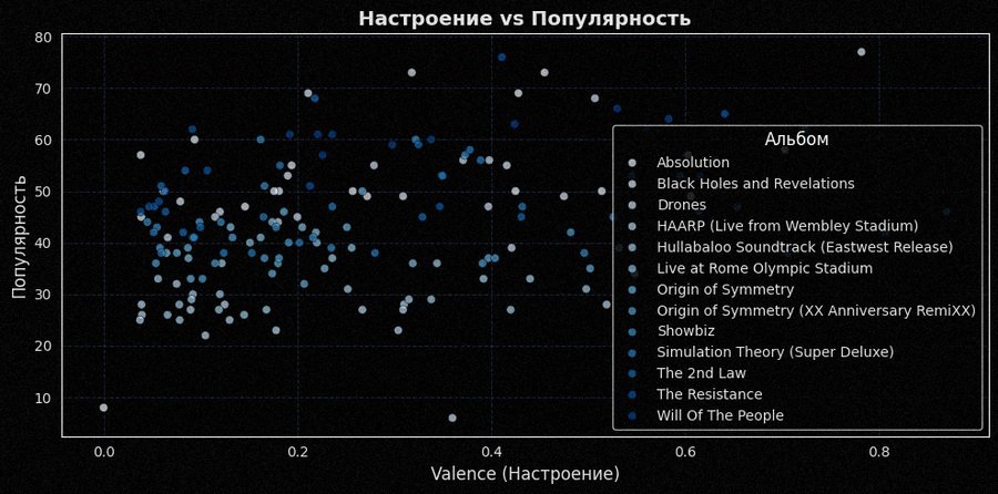 Эта диаграмма показывает связь настроения песен Muse и их популярность.